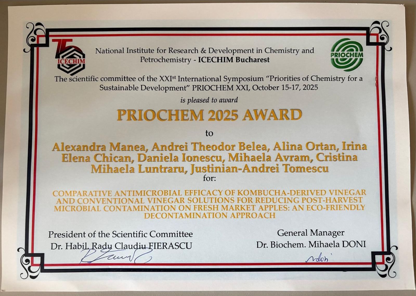 - Comparative antimicrobial efficacy of kombucha-derived vinegar and conventional vinegar solutions for reducing post-harvest microbial contamination on fresh market apples: an eco-friendly decontamination approach, Alexandra Ene-Manea, Andrei Theodor Belea, Alina Ortan, Irina Elena Chican, Daniela Ionescu, Mihaela Avram, Cristina Mihaela Luntraru, Justinian-Andrei Tomescu, Prioritățile Chimiei Pentru O Dezvoltare Durabilă, Priochem XXI, 15-17.10.2025, Bucuresti